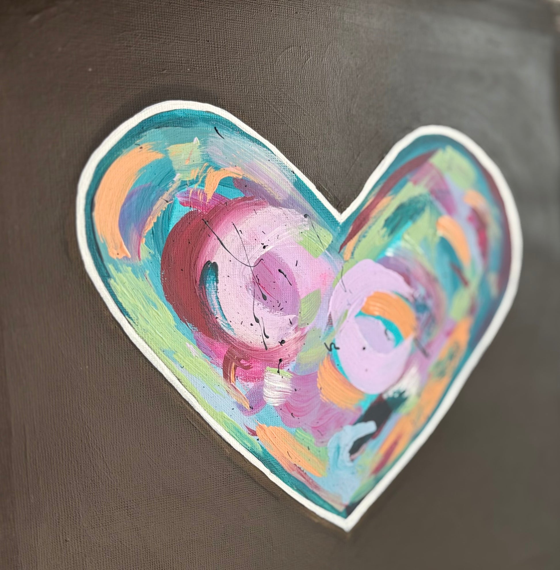 This vibrant abstract heart radiates movement and colour, set against a deep, moody background that makes every brushstroke glow. Swirls of teal, peach, pink, lilac and lively splashes of contrasting colour create a sense of joyful energy, while the soft white outline gives the heart a striking, sculptural presence.