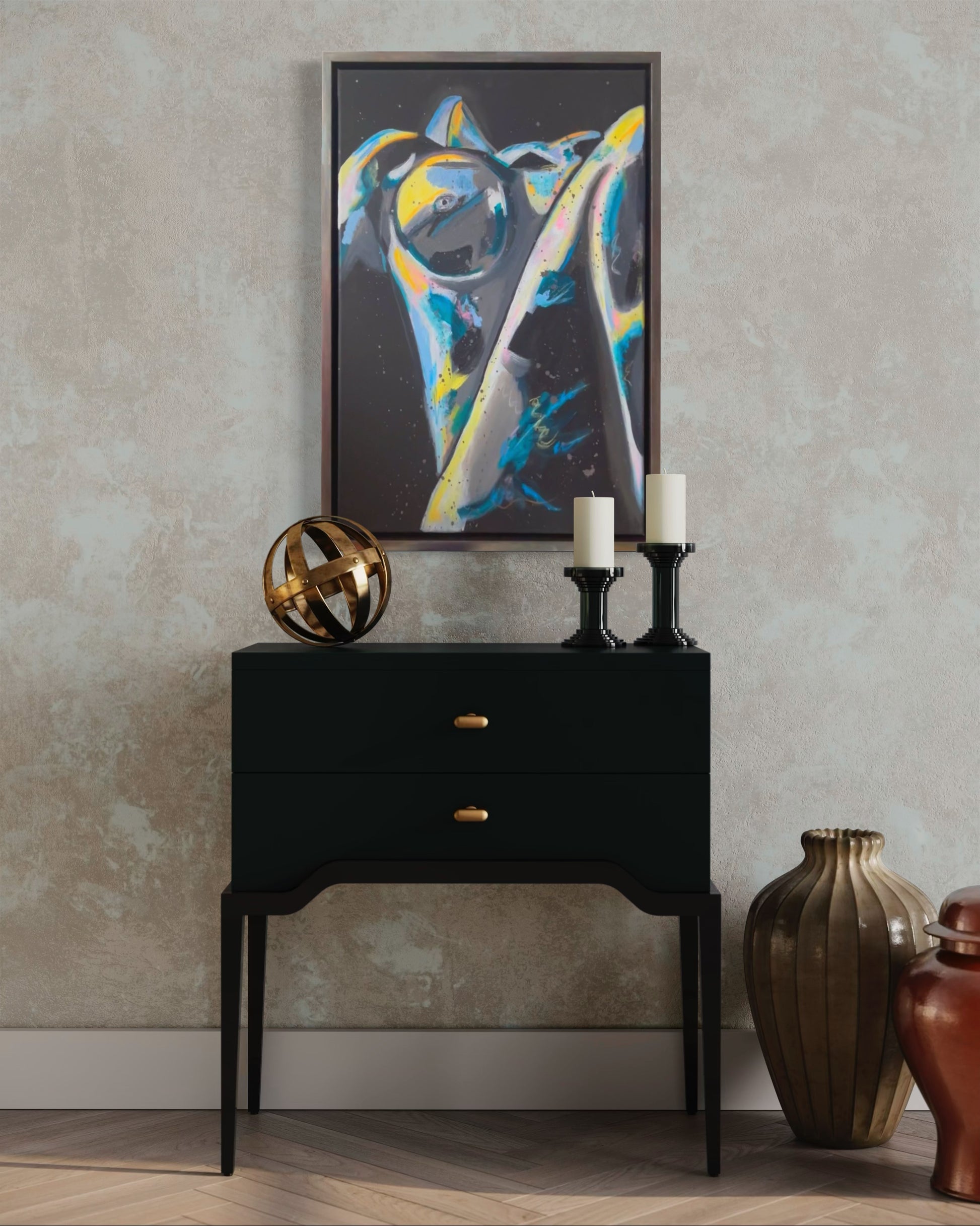 Expertly framed, this artwork is ready to hang and makes a powerful statement in any space — from contemporary living rooms and stylish bedrooms to upscale galleries and collector spaces.